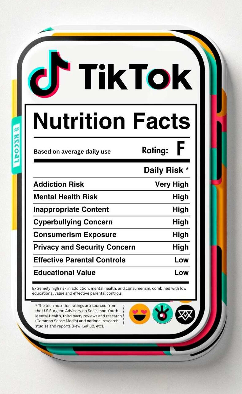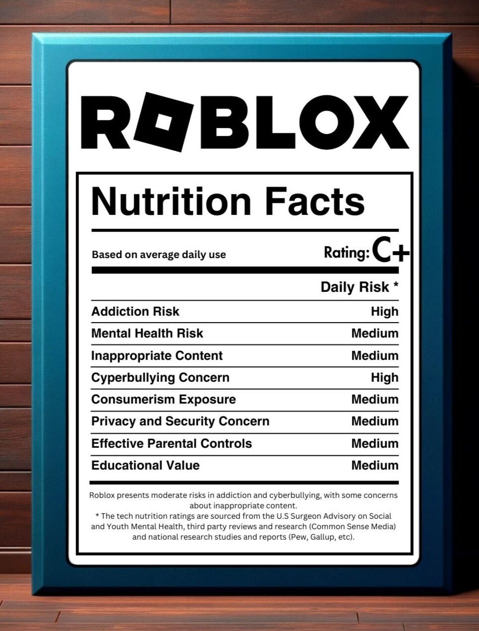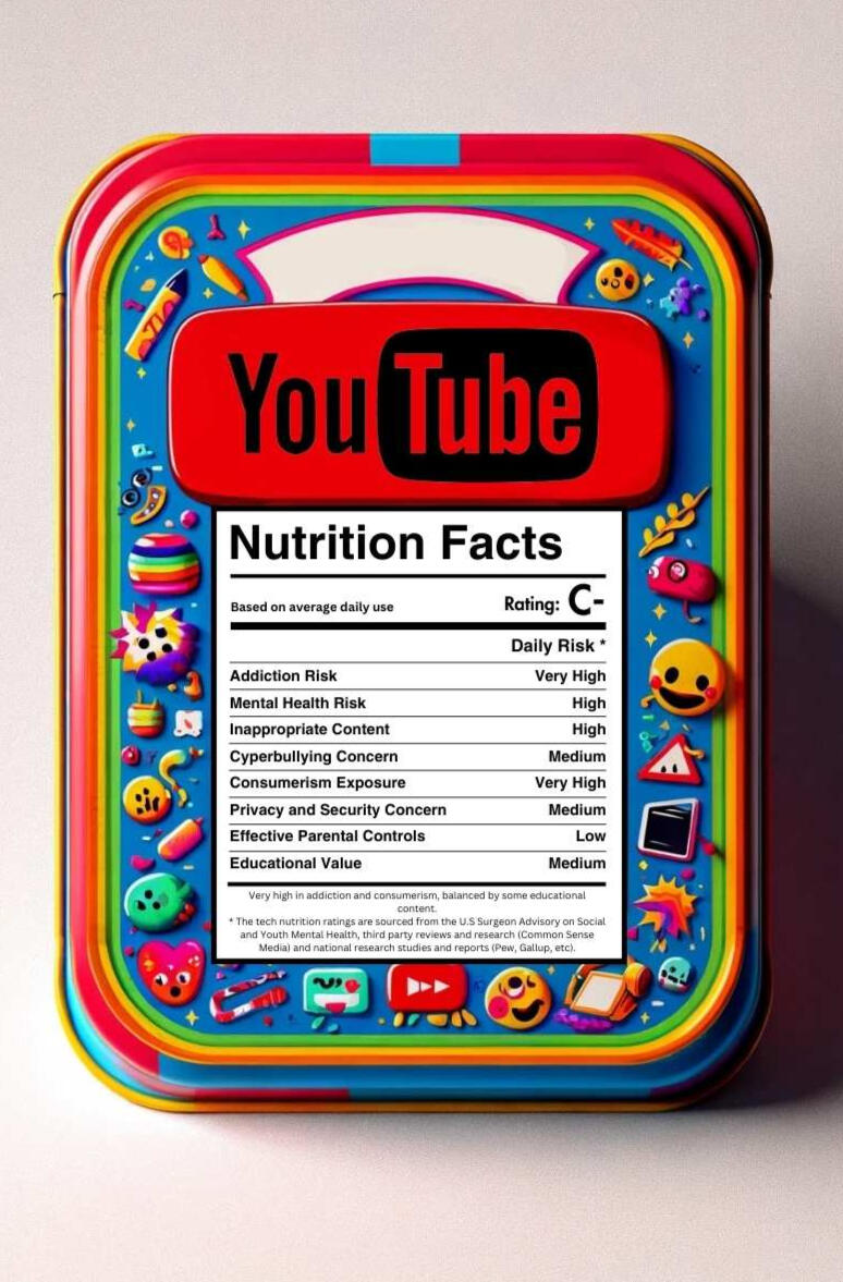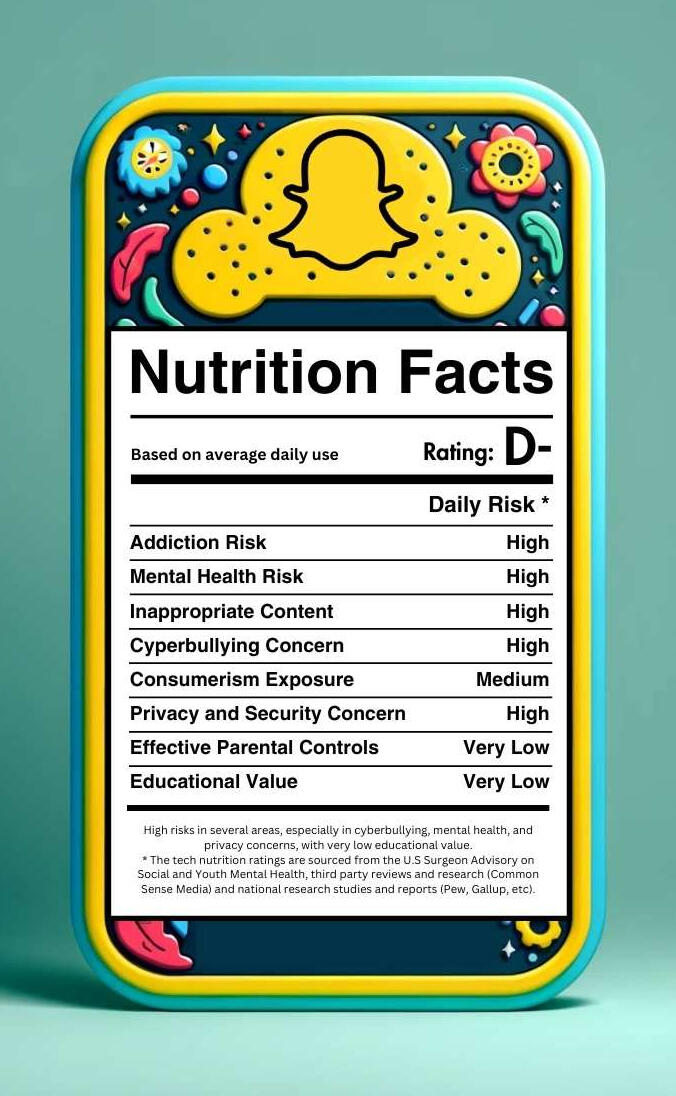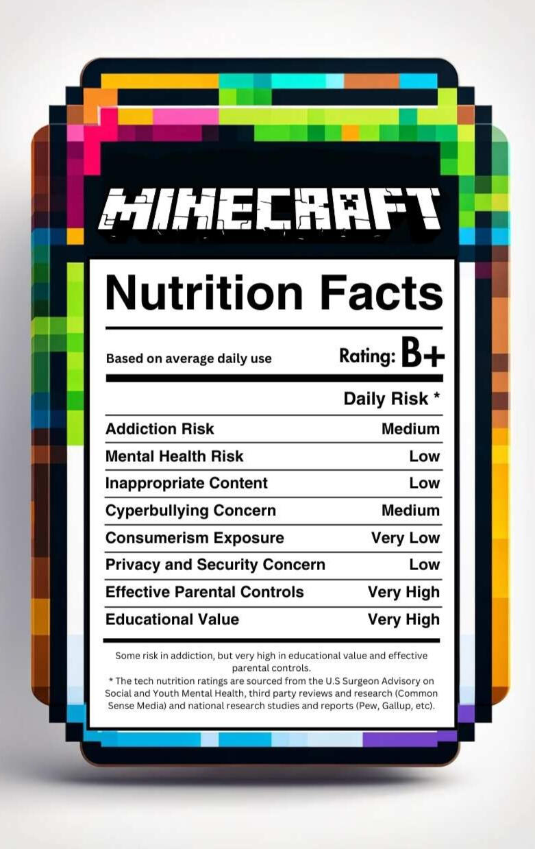 In today's fast-paced digital world, technology is a staple in our lives and the lives of our children. From educational apps to social media platforms, the digital environment our kids engage with every day is diverse and ever-evolving. As parents, it’s vital to understand not only the benefits but also the potential risks associated with these digital experiences.What Are 'Nutritional Facts for Technology'?Just like nutritional labels help us understand the contents of our food, "Nutritional Facts for Technology" aims to provide clear, concise information about various digital platforms and technologies. This initiative is designed to empower you, as parents, with knowledge about the digital "ingredients" your children are consuming. Our labels cover various aspects of technology usage, from addiction risk and cyberbullying prevalence to educational value and content appropriateness.Empowering Parents with KnowledgeOur goal is to offer a straightforward, easy-to-understand overview of popular digital platforms, including Minecraft, Instagram, Snapchat, and more. Each "Nutritional Fact" label uses a mix of text and emojis to convey information in a parent-friendly manner. Whether it's understanding the potential for addictive behavior on a gaming platform or assessing the educational value of a social media app, these labels are here to guide you in making informed decisions about your child's digital diet.Join Us in Making Digital Spaces SaferWe believe that awareness is the first step toward ensuring a safer and more balanced digital environment for our children. Explore our labels, learn about the different facets of digital platforms, and join us in creating a more informed community of digital-age parents.- Daniel Stedman, Founder and Senior Advisor
